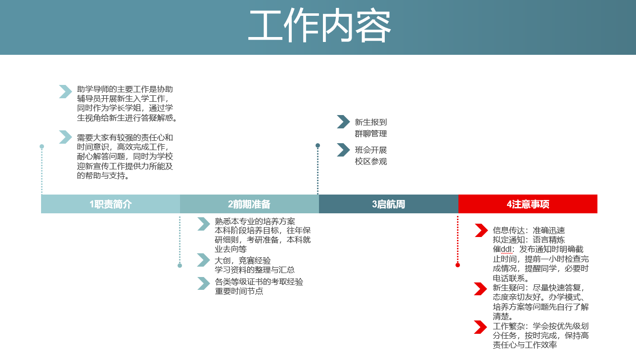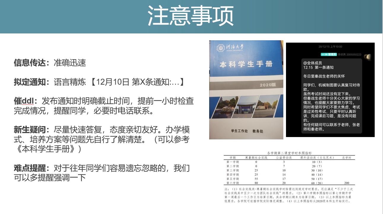 20级新能源科学与工程专业的李欣芮同学从自身的助学导师经历出发,分享了自己的工作经验,他根据不同的新生入学活动安排介绍了助学导师要做的工作,针对往届的工作中容易遗忘忽略的注意事项也进行了提醒,希望助学导师们能走进新生,帮助新生更好地适应大学生活。