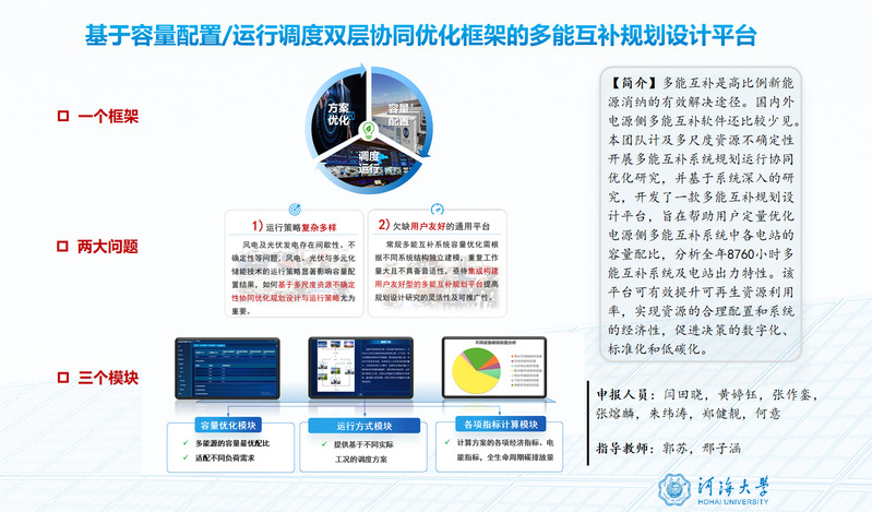 基于容量配置/运行调度双层协同优化框架的多能互补规划设计平台项目,面向国家政策需求,旨在提升电源侧多能互补项目容量配置工作的数智化水平。该平台考虑多尺度资源不确定性、不同实际工况下的多种运行调度方案,适配不同发电需求及电力市场要求,整合光伏、风能、光热等电源数据和蓄电池、储热等储能数据,形成全面的能源信息库,创新构建了容量配置与运行调度双层协同优化框架,引入概率可靠性指标LPSP-PoE,利用先进复合算法优化多能互补系统容量配置,确保优化后的系统容量满足系统高效经济运行需求。该平台可广泛应用于电源侧多能源系统规划、新能源项目评估和微电/能网规划等,有助于降低系统成本、提高竞争力。团队成员:闫田晓,黄婷钰,张作銮,张熔麟,朱纬涛,郑健靓,何意。指导教师:郭苏、邢子涵。
