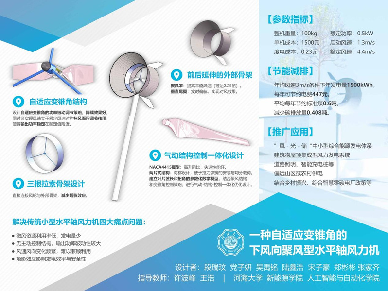 一种自适应变锥角的下风向聚风型水平轴风力机,该项目积极响应国家政策,旨在解决当前小型风力机设计存在微风发电少、功率波动性大、下风向塔影效应严重、难以兼顾利用不同风向与大幅变化的风速等问题。设计自适应变锥角的功率被动控制技术,使功率保持在额定功率附近且降载效果良好;三根拉索将风轮与外部骨架连接,减少塔影效应;聚风与对风偏航集成,提高来流风速的同时保证运行时的安全性与稳定性;建立叶片弦长和扭角的参数化数学模型,结合聚风结构和变锥角控制策略,进行气动-结构-控制一体化优化,提升整机全工况下的风能利用效率。团队成员:段瑞玟,党子妍,吴禹铭,陆鑫浩,宋子豪,郑彬彬,张家齐。指导教师:许波峰、王浩。