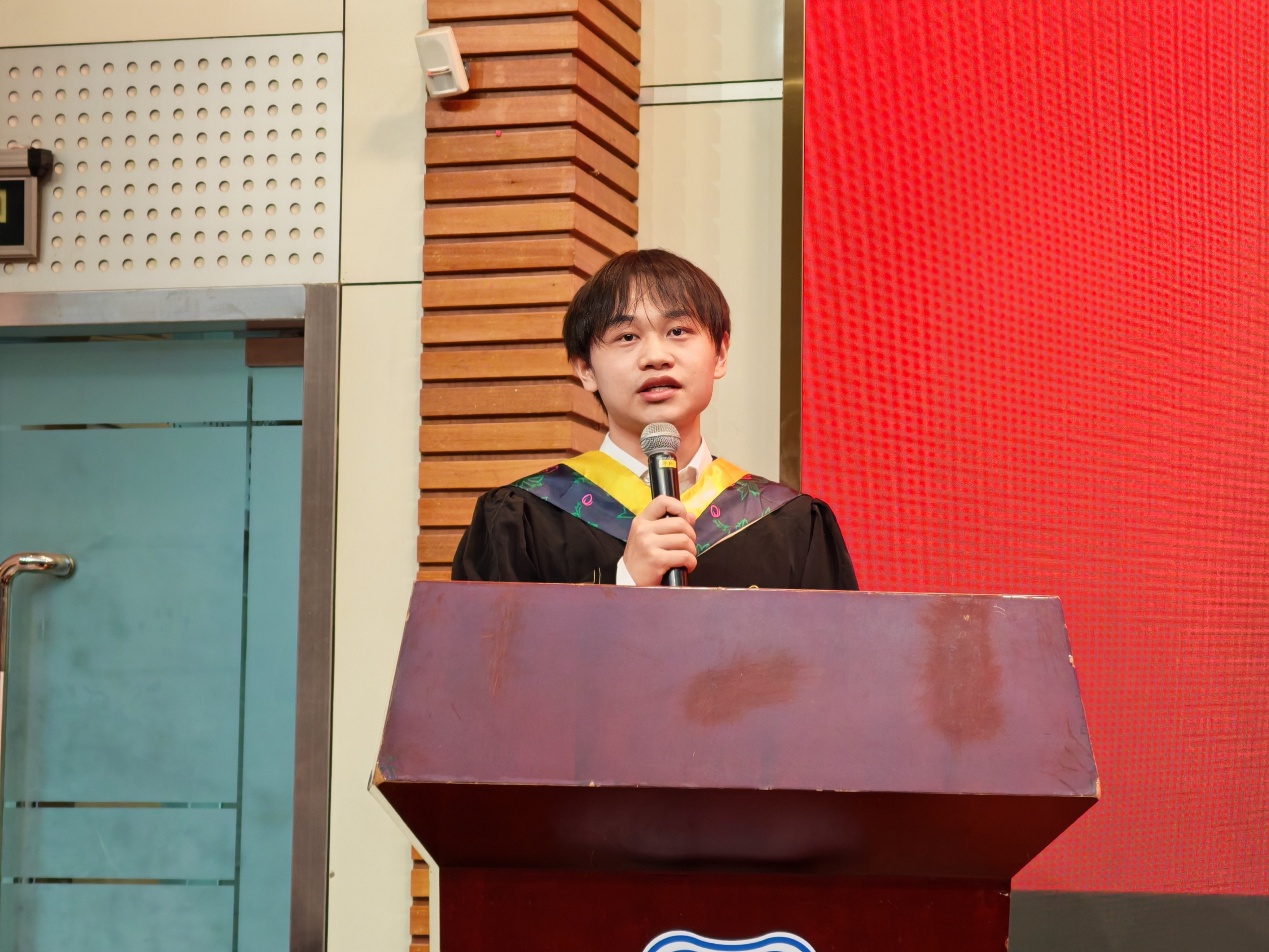 毕业生代表郭小庄同学,代表所有毕业生,分享了成长经历与感悟。他回顾了自己大学的成长历程,真挚表达了对学校学院培育之恩的深切感激,表达了对老师、同学的感恩之情,更以青春之名许下奋进誓言,号召同窗们永葆热忱之心,在人生新征程上突破自我,书写属于时代青年的精彩篇章。