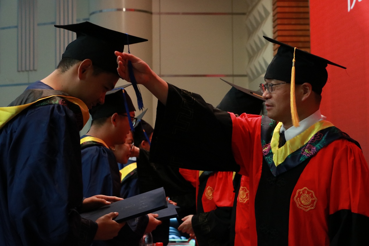 在双证颁发环节,学院领导班子和教师代表为全体毕业生发放毕业证、学位证,拨穗正冠并合影留念。