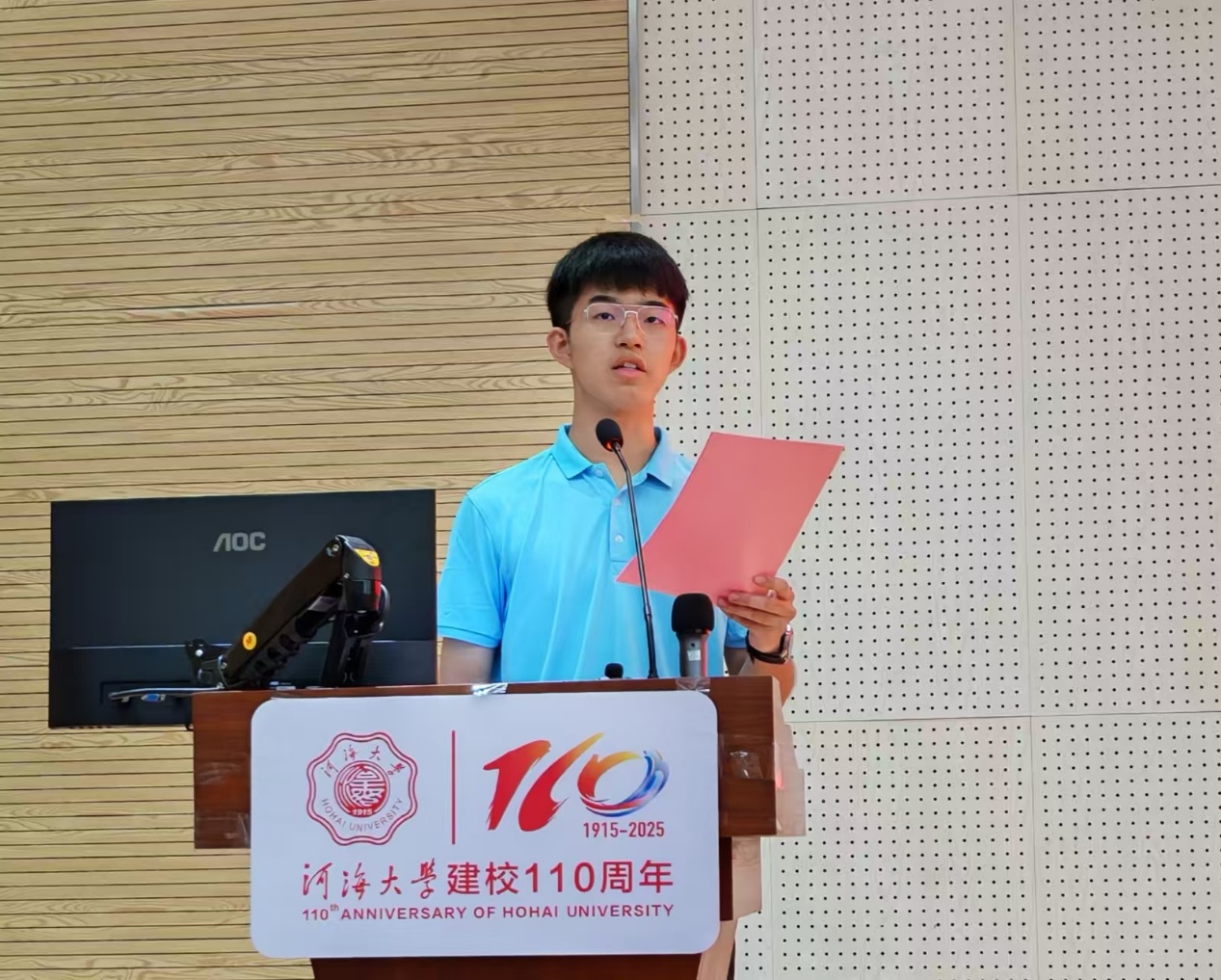 新生代表、新能源4班林子程同学发言时,分享了自己选择新能源专业的初心 —— 站在化石能源向可再生能源转型的历史转折点,新能源不仅是学科,更是使命。他提及“河海”二字承载的百年责任:从张
