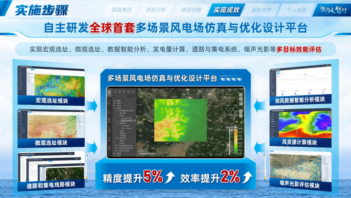 该项目由薛飞飞主持,由沈金荣等老师指导,高天尧、范恩齐等同学参与,针对水电水利规划设计总院命题要求,开发了高精度仿真优化设计平台和叶片健康监测平台,实现仿真精度提高5%、发电效率提高2%,助力风电软件国产化进程。