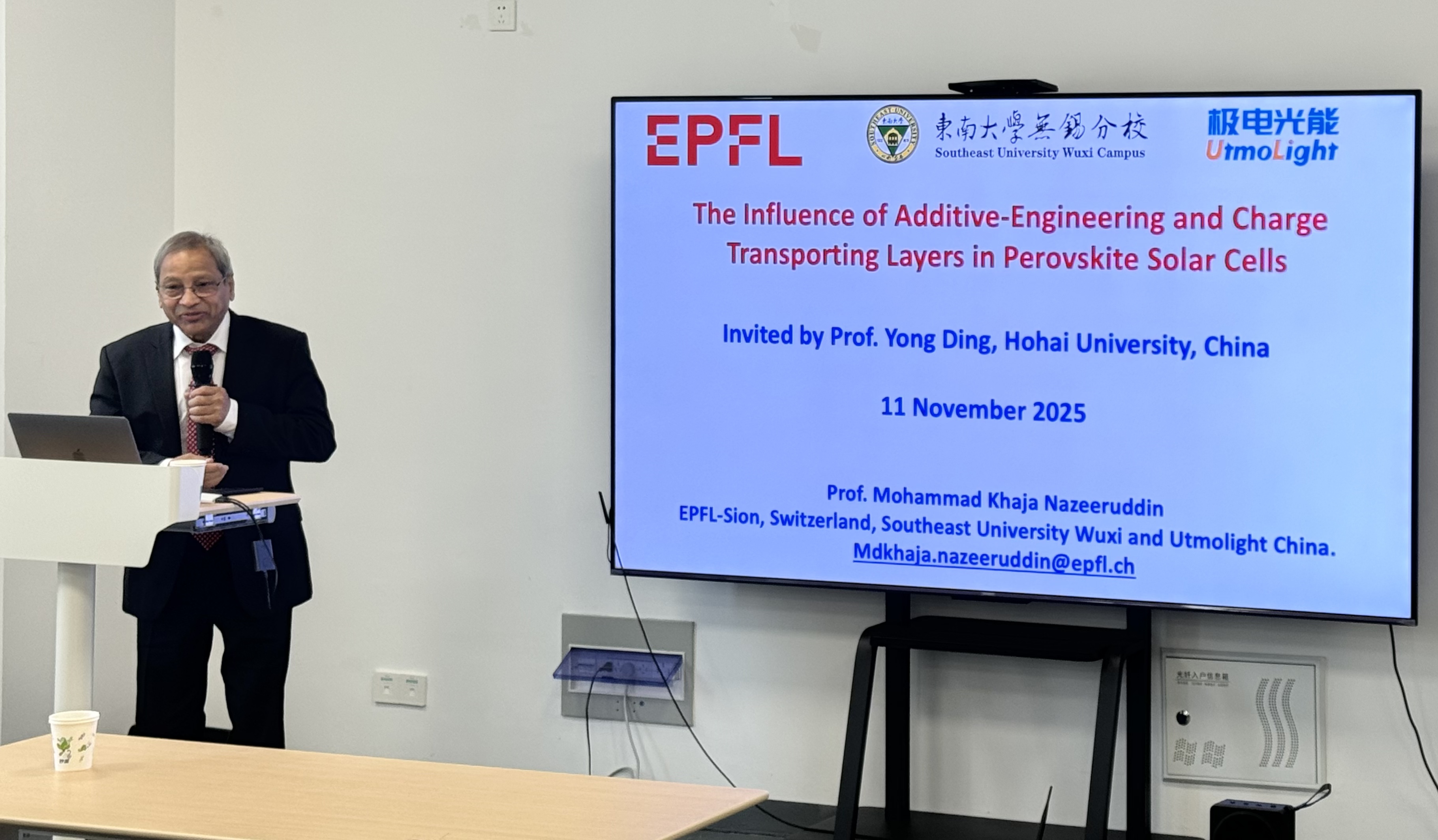 2025年11月11日,应我校2138CC太阳集团邀请,国际杰出科学家、瑞士洛桑联邦理工学院(EPFL)Prof. Md. K. Nazeeruddin教授莅临我校,作题为“Perovskite Solar Cells: A new Paradigm in Energy Sector”(钙钛矿太阳能电池:能源领域的新范式)的专题学术报告。报告在2138CC太阳集团会议室举行,由2138CC太阳集团丁勇教授主持。吸引了来自光伏、风电、材料等多个专业的师生参加,现场座无虚席,气氛热烈。