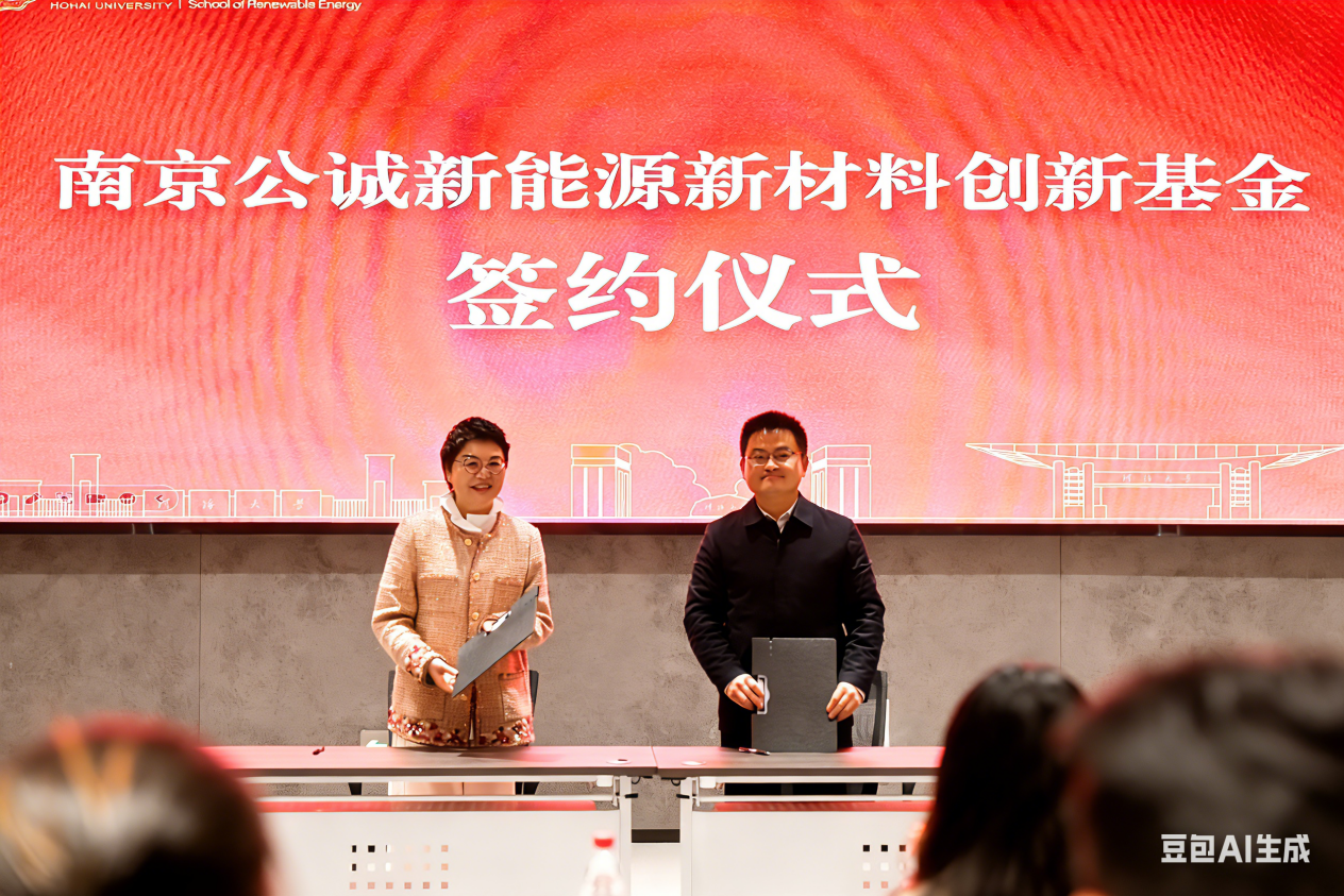 在基金签约环节,校国内合作发展处处长、基金办主任朱乔与南京公诚节能新材料研究院董事长孙俊杰共同签署南京公诚新能源新材料创新基金捐赠协议。朱乔处长代表学校向孙俊杰董事长颁发了捐赠证书。